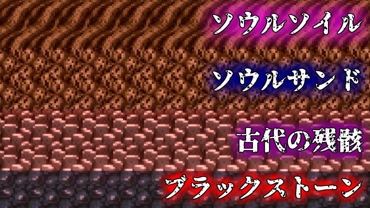 ブラックストーン、古代の残骸、ソウルサンド、ソウルソイル、このブロック達は順番に置くと境目が違和感なく繋がるんです。そこから見えた悲しい物語。