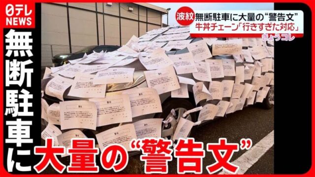 牛丼チェーン側は、近隣住民などからの「紙が剥がれ落ちて飛んできている」という指摘を受け、1枚だけ残して紙を剥がすよう店舗に指示しました。その後、車の持ち主は今後、無断駐車をしないと約束したということです。