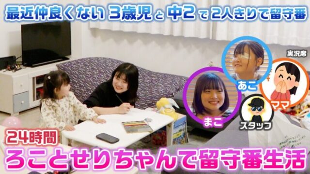 今回はろことせりちゃんで24時間留守番生活ということで、スタッフないPやママ、まこあこは別の場所から私たちをカメラで監視して、ろことせりちゃんだけで1日生活していくという企画になっています…。