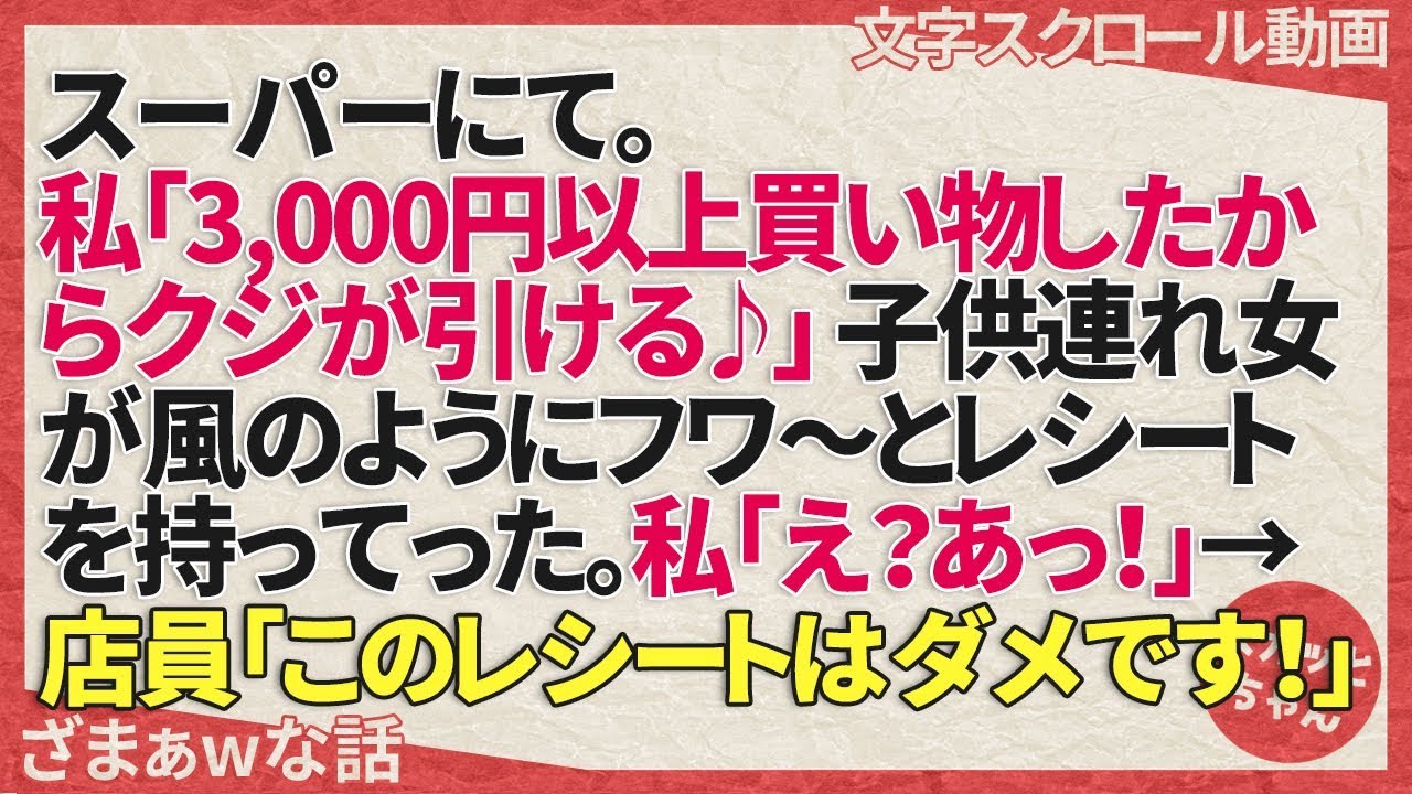 ◆ 動画のあらすじざまぁwな話 スーパーにて。私「3,000円以上お買い物したからクジが引ける♪」子供連れ女が風のようにフワ〜とレシートを持ってった。私「え?あっ!」→店員「このレシートはダメです!」==================◆ ...